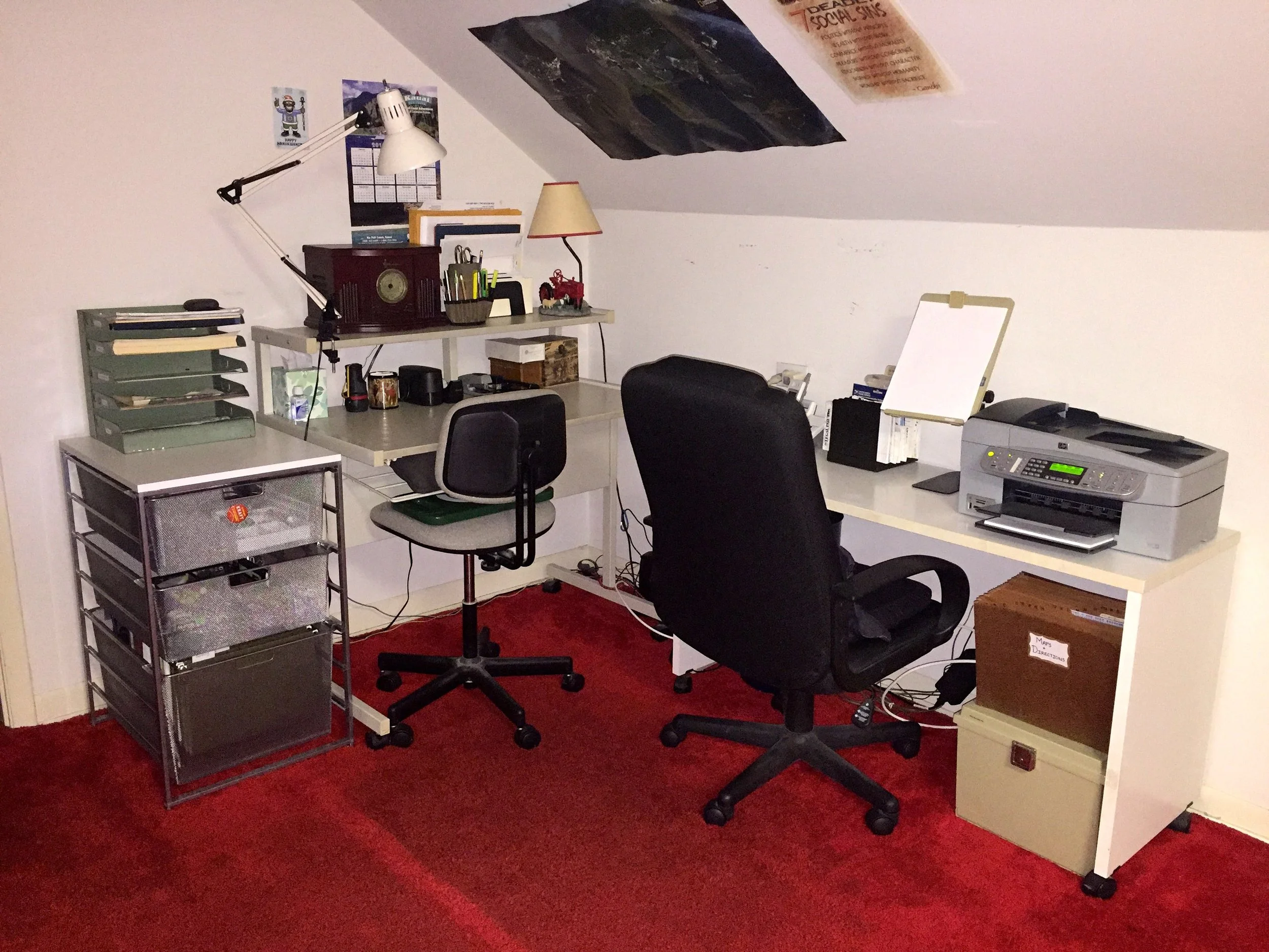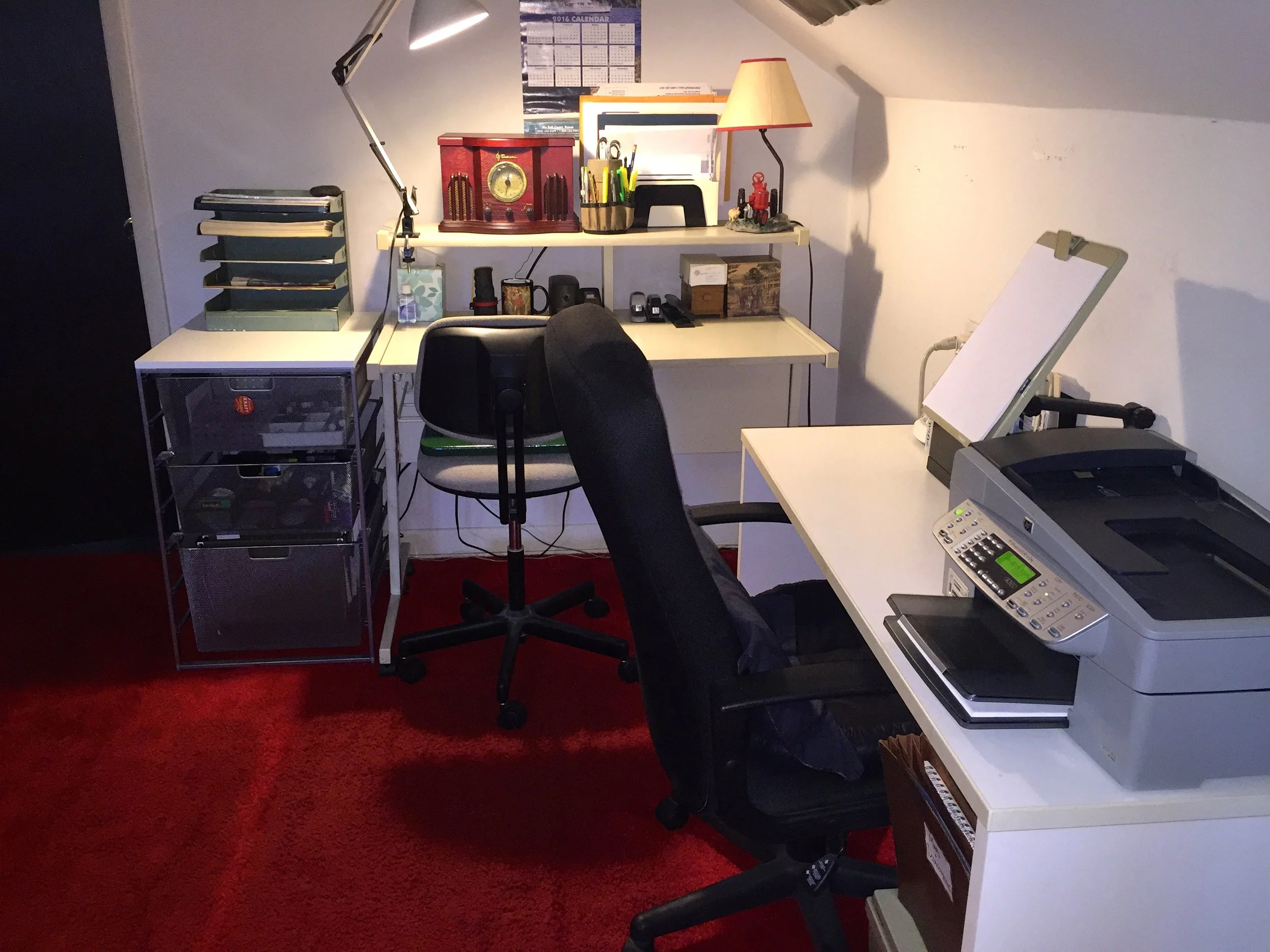 This separate storage structure was purchased early in the project after qu9ickly deciding that another structure was needed to house all of the client's office materials. Obtaining an additionalseparate, portable structure to an home office is sometimes necessary in order to prevent office materials from getting crammed and jammed into too small of storage space.